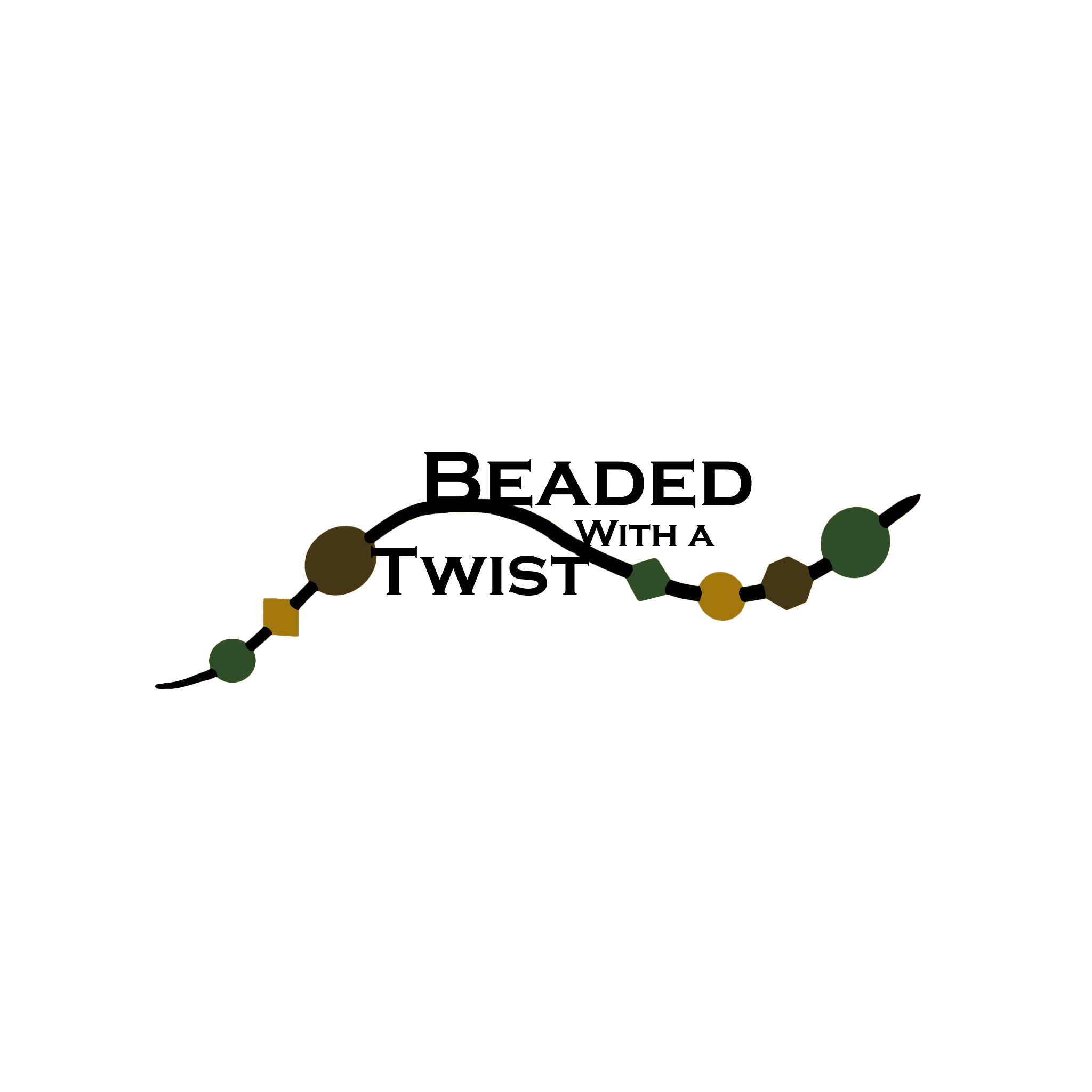 Logo with the text 'Beaded Twist with a' over a string of beads in green, yellow, brown, and black colors, set against a tan rectangle background.